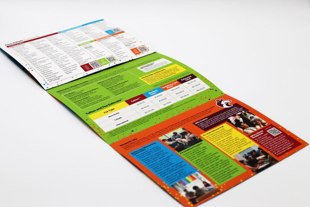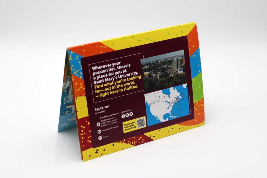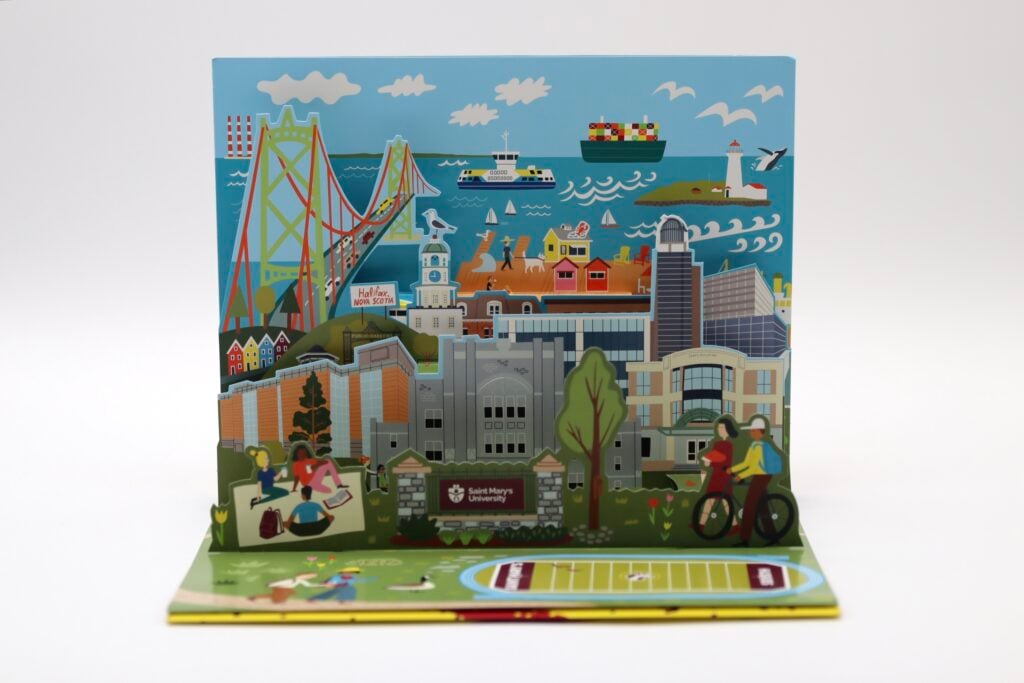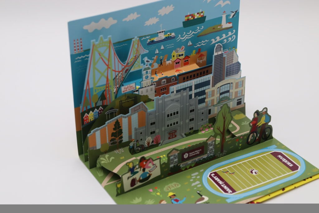 St. Mary’s University used this engaging pop-up mailer to recruit prospective students to its Halifax campus. Mailed flat for cost efficiency, the piece unfolded to reveal a colorful, dimensional replica of the university and vibrant scenes of Halifax, Nova Scotia—including the school’s athletic field. Further inside, a dedicated panel highlighted the various areas of study offered, along with unique QR codes that allowed recipients to explore each program in more detail. This creative design effectively combined visual impact, interactivity, and affordability to deliver a wealth of information in one memorable mailer.