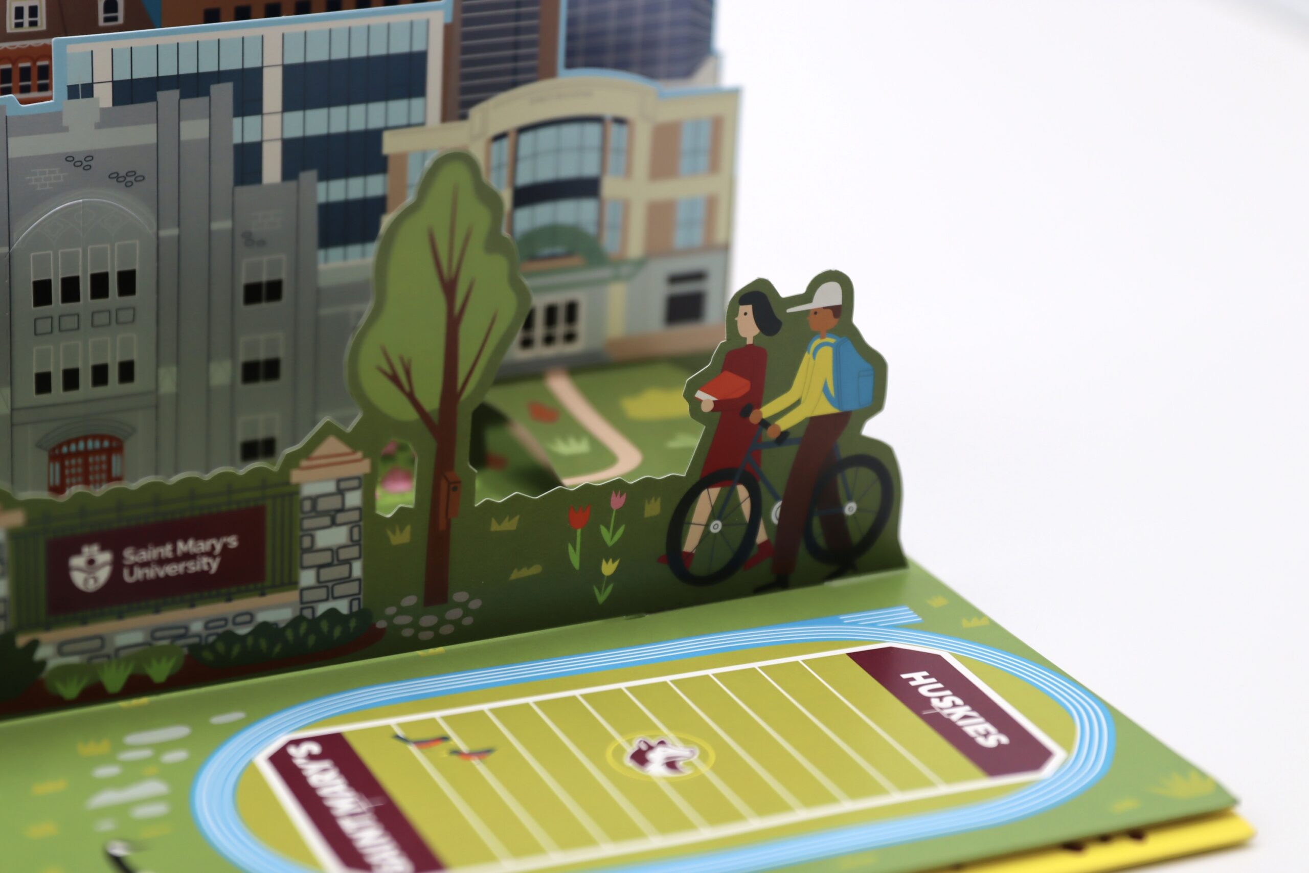 St. Mary’s University used this engaging pop-up mailer to recruit prospective students to its Halifax campus. Mailed flat for cost efficiency, the piece unfolded to reveal a colorful, dimensional replica of the university and vibrant scenes of Halifax, Nova Scotia—including the school’s athletic field. Further inside, a dedicated panel highlighted the various areas of study offered, along with unique QR codes that allowed recipients to explore each program in more detail. This creative design effectively combined visual impact, interactivity, and affordability to deliver a wealth of information in one memorable mailer.